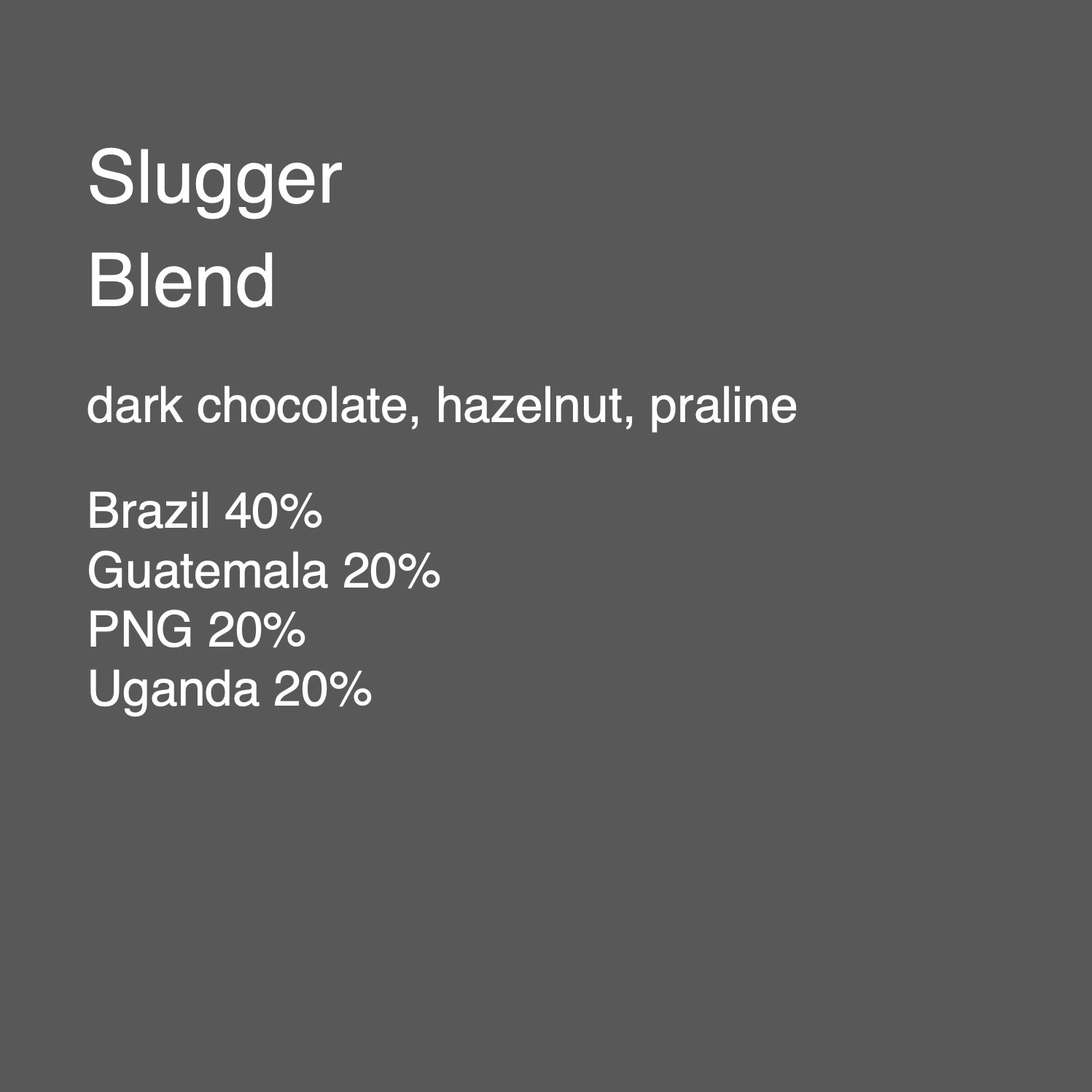 Origins: Brazil, Guatemala, Papua New Guinea, Uganda Cupping Notes: dark chocolate, hazelnut, praline